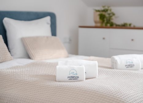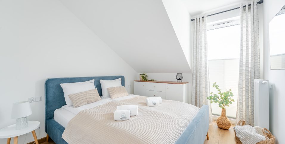 Przytulna sypialnia z dużym, wygodnym łóżkiem oraz miękkim zagłówkiem zapewnia komfortowy sen. Jasna kolorystyka, subtelne oświetlenie oraz tekstylia w neutralnych odcieniach sprzyjają relaksowi. Dodatkowa przestrzeń do przechowywania oraz telewizor zwiększają wygodę podczas pobytu.