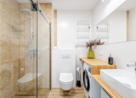 Nowoczesna łazienka łączy biel z ciepłym odcieniem drewna. Do dyspozycji gości jest przestronny prysznic typu walk-in z przeszkloną kabiną, umywalka z dużym lustrem oraz praktyczna pralka. Estetyczne wykończenia i funkcjonalna zabudowa zapewniają wygodę zarówno przy krótkich, jak i dłuższych pobytach.