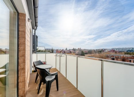 Do apartamentu przynależy balkon wyposażony w stolik i krzesła, który stanowi idealne miejsce na poranną kawę lub odpoczynek na świeżym powietrzu. Widok na spokojną okolicę sprzyja relaksowi i pozwala oderwać się od codziennego zgiełku.