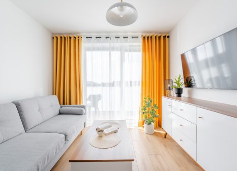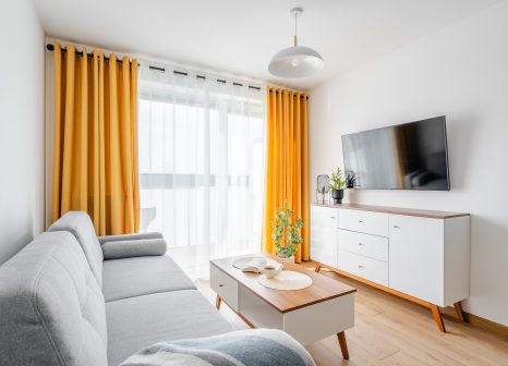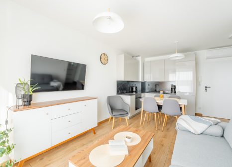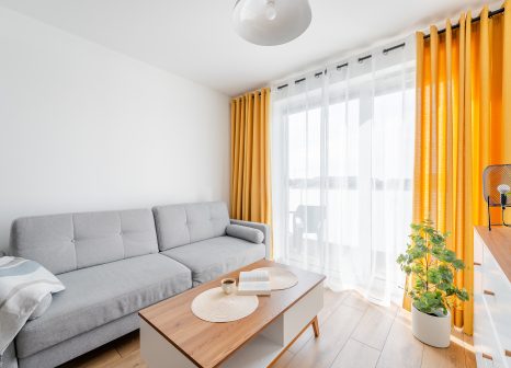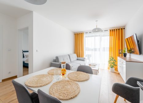 Wnętrze apartamentu zachwyca nowoczesnym, minimalistycznym stylem z wyraźnymi akcentami skandynawskimi. Dominują tu jasne barwy – biel, szarości oraz naturalne drewno, które tworzą harmonijną i lekką przestrzeń. Charakteru dodają intensywne, musztardowe zasłony oraz eleganckie, ciemne wykończenia w kuchni. Starannie dobrane dodatki, rośliny oraz duże przeszklenia sprawiają, że apartament jest pełen światła i przytulnej atmosfery.