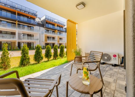 Wyposażenie pokoju obejmuje między innymi telewizor, w pełni wyposażony aneks kuchenny, rozkładaną sofę oraz podwójne łóżko. Taras zachwyca aranżacją, a stworzone miejsce pozwala na relaks o każdej porze dnia.