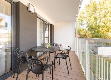 Przytulna, rozkładana sofa w odcieniu jasnej szarości, stolik kawowy z drewnianym blatem oraz duży telewizor smart TV tworzą komfortową strefę relaksu. Na miękkim dywanie można wygodnie odpocząć po dniu spędzonym na plaży, a klimatyzacja dba o przyjemną temperaturę niezależnie od pory roku. Z salonu prowadzi wyjście na szeroki balkon wyposażony w okrągły stół i cztery designerskie krzesła – idealne miejsce na poranną kawę lub wieczorną lampkę wina.