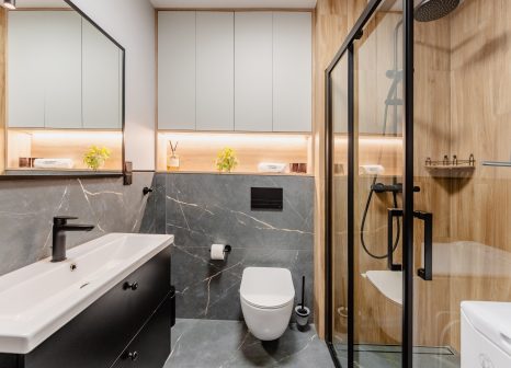Nowoczesna łazienka utrzymana w eleganckiej tonacji szarego kamienia i drewna, z czarną armaturą oraz dużym lustrem w ramie. Przestronny prysznic typu walk-in z deszczownicą i przeszkloną kabiną, funkcjonalna zabudowa na kosmetyki, podświetlane wnęki oraz praktyczna pralka zapewniają wygodę zarówno podczas krótkiego, jak i dłuższego pobytu.